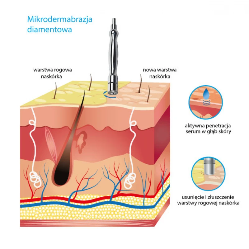 Lecznicze działanie mikrodermabrazji diamentowej wynika z faktu, iż końcówka diamentowa w połączeniu z podciśnieniem oddziałuje nie tylko na naskórek, ale także na głębszą, brodawkowatą warstwę skóry właściwej.